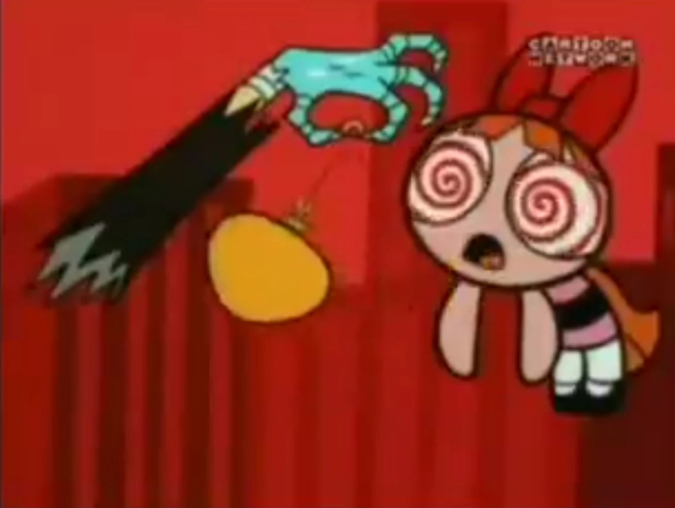 In addition to the above inconsistency, another inconsistency occurs dealing with Abracadaver's right arm. When Buttercup punches Abracadaver into the building and causes him to fall apart, his right arm stays behind to keep Blossom under his control. When he collides with the wall, as well as when he reassembles himself, he is shown to be missing his entire right arm, from the shoulder down. However, when he reattaches the arm that was holding the chain, he is shown to only be missing his right arm from roughly the elbow down.