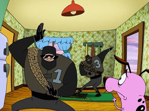 After Courage finds a blue stone and gives it to Muriel that makes her invisible, the superior of the base asks the Federal Agents to find it and bring the person responsible. The Bag family is eating, until it looks like three ninjas in search of the stone, they take Muriel to interrogate her about the disappearance of the stone but she thinks that they want to know the dog food recipe that was competing.