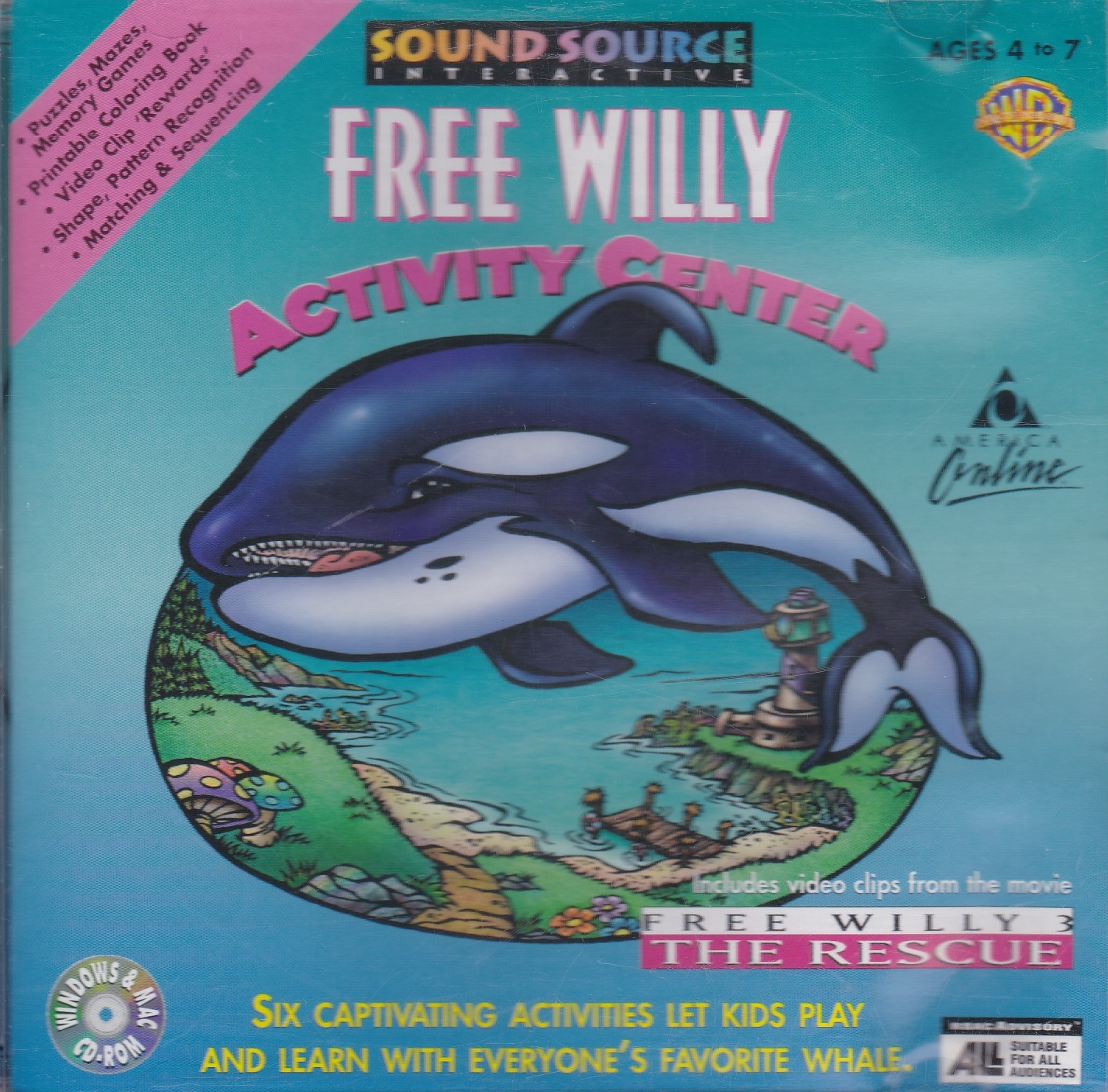 Free Willy Activity Center is a 1997 game that could be played by inserting the CD rom of the game. The game involved by Sound Source Interactive, playing activities to earn Certificates. The certificates were Crab, Dolphin, Octopus, Orca, Otter, Shark, Seahorse, Starfish, Blue Tang and Sea Turtle.