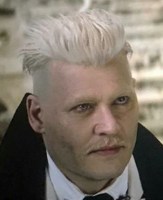 While he was middle aged, Grindelwald's hair was pale blond and shaved on the sides of his head giving him a sleek look; he also had a thin white moustache. His right eye was grey, while his left was dark, and his face was pale.