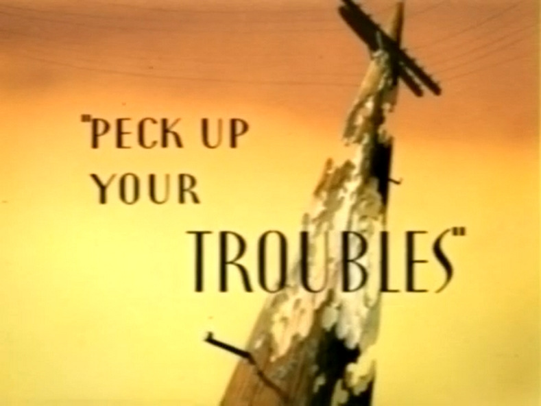 His next plan, He uses stilts to get the woodpecker, as Sylvester walks towards the woodpecker, the woodpecker pecks on the stilts one by one until none of them are left. And that makes Sylvester fall, but luckily he holds on the limb of the tree. As he sees the woodpecker make a "Cut on dotted line" and pecks it and makes him fall, the limbs comes down steady now and getting closer and closer to the ground, and Sylvester waves goodbye and he falls.