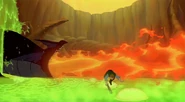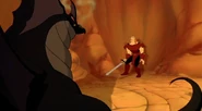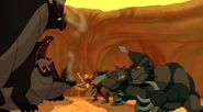 Not long afterwards, when the pair first meet Devon and Cornwall who are bullied due to their smaller size and inability to breathe fire or fly, the group are quickly attacked by the dragons. Devon and Cornwall help them cross the acid lake. As Garrett has trouble crossing the lake, One of the Dragons caused a tidal wave sending Garrett to the other side, unharmed. All of the black dragons breathe fire at the group who narrowly avoid them and they see the Griffin flying and Ruber and his army (who has caught up with them) running on the opposite side. The heroes hide in a wormhole underground tunnel as Ruber and his army faces the dragons. Ruber slows backs up on the wall, just as the dragon approaches him; Ruber then punches the dragon in the face, killing it instantly and later roasts it on a spit for him and his henchmen to eat.