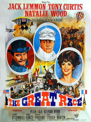The Great Race is a 1965 American Technicolor slapstick comedy film starring Jack Lemmon, Tony Curtis, and Natalie Wood, directed by Blake Edwards, written by Arthur A. Ross (from a story by Edwards and Ross), and with music by Henry Mancini and cinematography by Russell Harlan. The supporting cast includes Peter Falk, Keenan Wynn, Arthur O'Connell and Vivian Vance. The movie cost US$12 million (equivalent to $98.36 million in 2020), making it the most expensive comedy film at the time. The story was inspired by the actual 1908 New York to Paris Race.